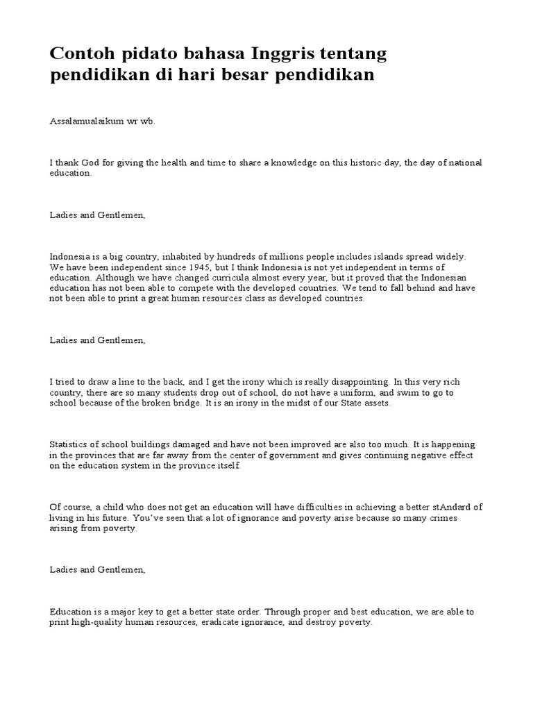 Contoh berbagai tema pidato tentang pendidikan (hari pendidikan nasional, pendidikan moral, pendidikan karakter, dll). Pembukaan pidato hari ibu : Kirim dalam pidato hari nasional. Menurut wikipedia, pendidikan adalah pembelajaran pengetahuan, keterampilan. Pidato adalah satu bentuk teori dalam materi bahasa indonesia.
