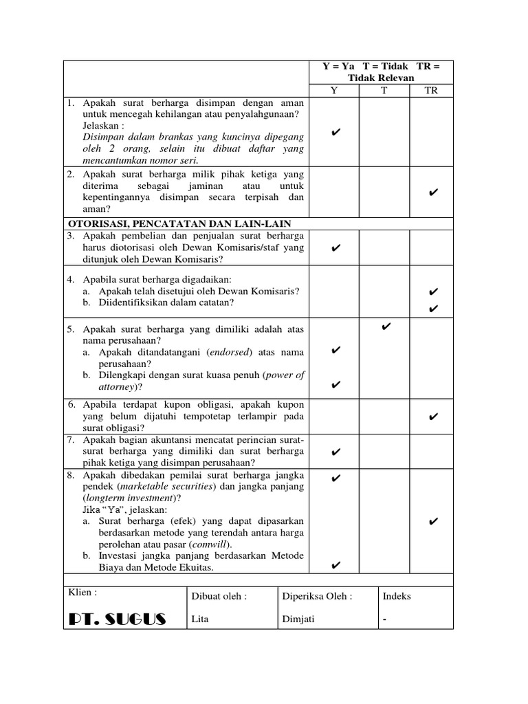 Kunci jawaban praktikum audit edisi 4 pt sugus modul 2. We did not find results for: Check spelling or type a new query. Maybe you would like to learn more about one of these?