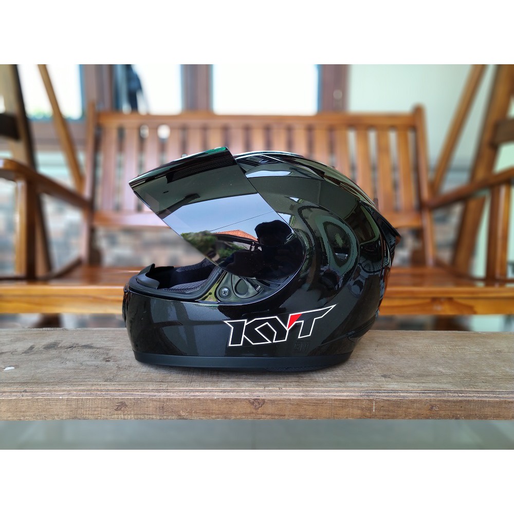 1 helm kyt r10 1 visor iridium blue 1 spoiler 1 set stiker visor 1 kyt r10 black doff. Single visor, sni, busa bisa dilepas, system pengaman quick release buckle kelengkapan :
